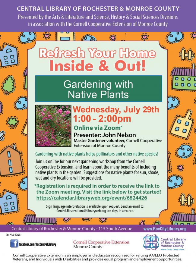 Join us online for our next gardening workshop from the Cornell Cooperative Extension, and learn about the many benefits of including native plants in the garden. Suggestions for native plants for sun, shade, wet and dry locations will be provided.