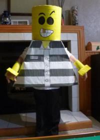 For the hands, she used three foam “coozies.” Cut the bottom out of two to slide over the hands and cut the third in half and used the yellow duct tape to form the lego type hands.