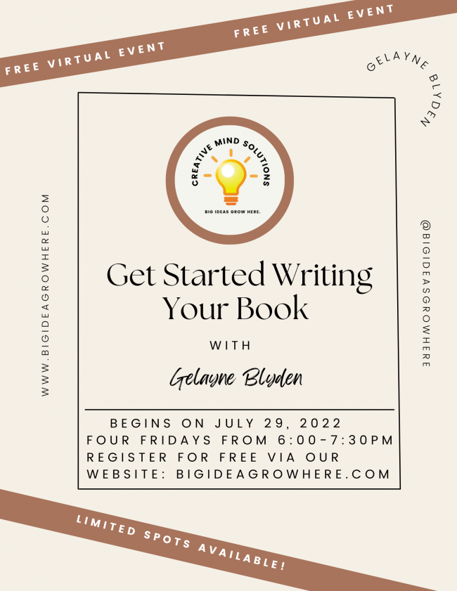 In this four-week workshop, participants will learn strategies to organize themselves and gain practical tips to start their books. Participant will begin implementing strategies and techniques and will begin writing their manuscript. This workshop is completely free. This is a virtual course and will begin on Friday, July 29, 2022 from 6:00 pm - 7:30 pm EST. Classes are scheduled to take place weekly.