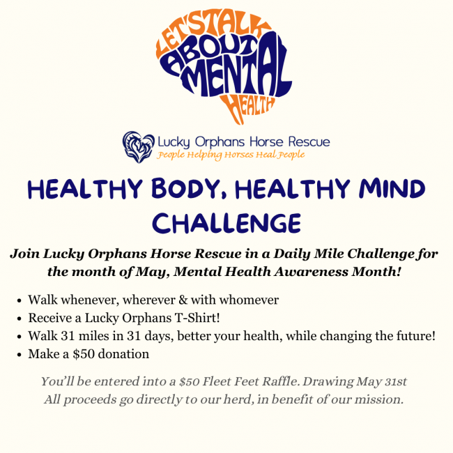 Join us in supporting mental health awareness and Lucky Orphans Horse Rescue's invaluable services by taking part in the Mental Health Mile A Day Challenge this May.
