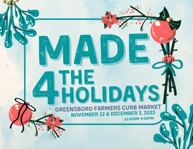 MADE 4 the Holidays Market, the area’s largest juried holiday shows featuring local artisans produced by the 501 community non-profit Greensboro Farmers Market, Inc. (GFM). This event is a treasured shopping tradition in Greensboro offering a wide variety of handcrafted and curated products including jewelry, body care items, pottery, artwork, wood turnings, glass objects, fiber and fabric art, up-cycled art, delicious shelf-stable NC food products, and more. All products at MADE 4 Market Holiday Shows are locally made and showcase more than 75 emerging and favorite returning unique artisans from around the Piedmont and surrounding areas. Proceeds from MADE 4 the Holidays benefit the artisan vendor directly, which helps to keep dollars in the community while supporting talented local artists.