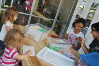 Luckily, forcing them to move into another area of the museum only brought more fun and adventures. There were so many opportunities for creativity and art - for kids of all ages! My oldest gravitated towards an area where she was able to make a greeting card for a relative back home. In addition to the typical craft supplies you would expect to have available to you for card making, they had tiny lights and batteries that you could use to add lights to your project. The New Children's Museum had staff members supervising all of the areas of the museum, so when Kailyn (9) expressed an interest in making a card with the lights, one of the staff instantly began working with her one-on-one to not only make her vision come to life, but teach her about how the electrical circuits work so that she could adhere the battery to one part of the card, and run a wire (from a pipe cleaner) to the lights.