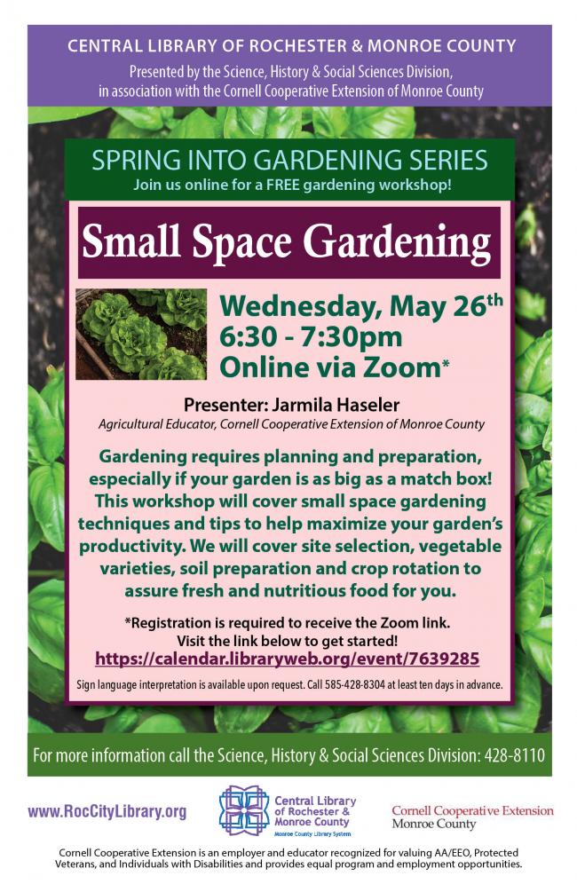 Join us online for the next Zoom program in our Spring Into Gardening Series: Small Space Gardening presented by Jarmila Haseler, Agricultural Educator from the Cornell Cooperative Extension of Monroe County!